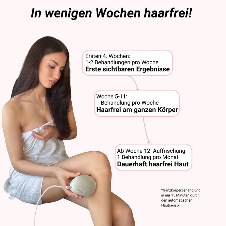 In den ersten vier Wochen genügt eine IPL-Behandlung pro Woche. Dank der fortschrittlichen Technologie sind Ganzkörperbehandlungen mittlerweile in weniger als 15 Minuten möglich. Eine schnelle und unkomplizierte Beauty-Routine, die in jeden Alltag passt und sichtbare Ergebnisse liefert.