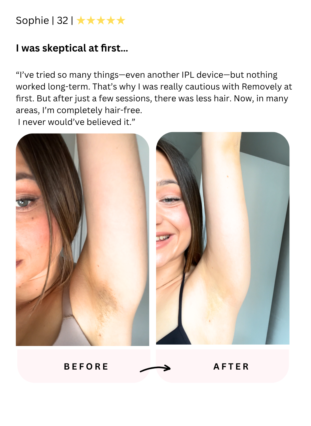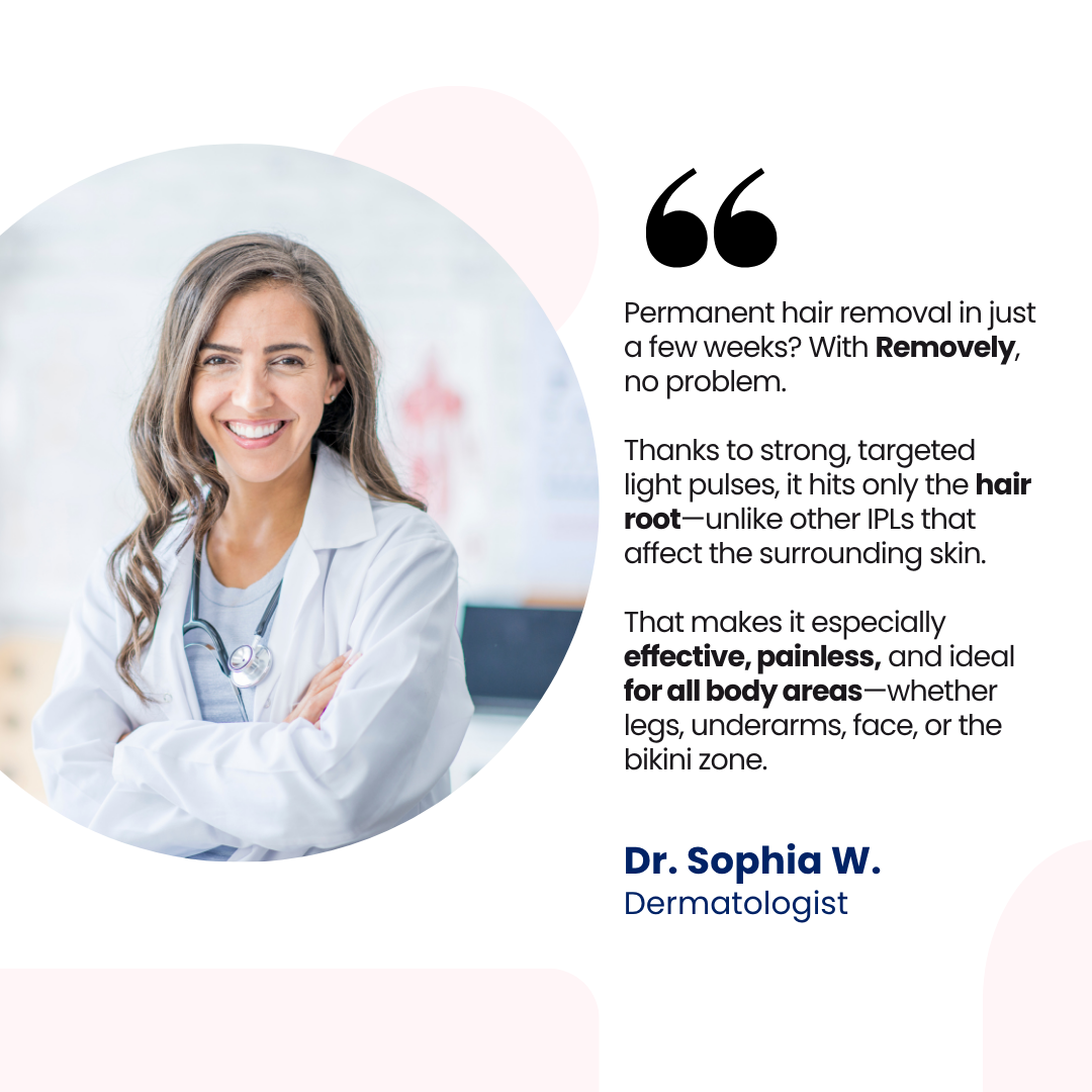 With Removely, that’s over: long-lasting, visible hair-free results in just a few weeks. Effective hair removal like a laser studio, thanks to cutting-edge 2025 IPL technology. Clinically certified, and trusted by over 50,000 women.